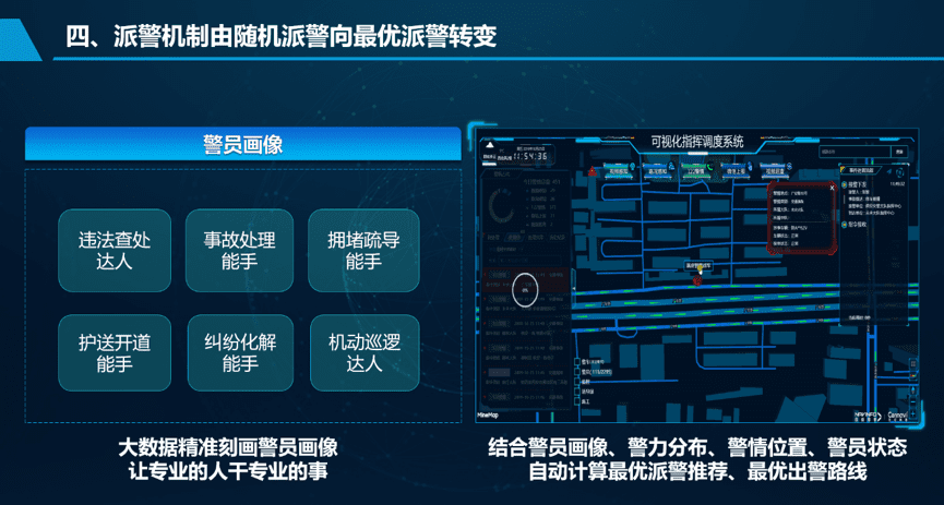 解决计划:世纪高通依托海量数据优势,运用大数据画像手艺为民警绘制警员画像,例如:通俗事故处置惩罚能手、重大事故处置惩罚能手、拥堵疏导能手等。指挥中心凭证警员画像,团结警力漫衍、事务位置、警员状态等多个维度,天生最优派警模子(手艺最优、路径最优),让专业的人干专业的事。