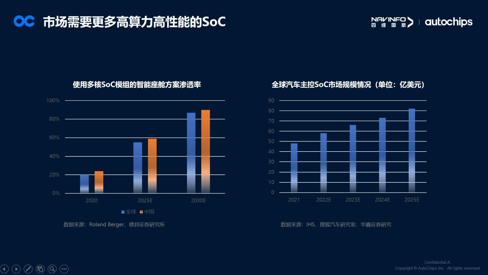 在演讲中,马伟华从汽车电动化智能化浪潮引领车规SoC和MCU厘革谈起,汽车EE架构厘革将导致市场需要更多高算力高性能的自动驾驶SoC和智能座舱SoC。据IHS Markit预计,2024年座舱NPU算力需求将是2021年的10倍,CPU算力需求是2021年的3.5倍。全球使用多核SoC模组的智能座舱计划渗透率将在2025年靠近60%,2030年凌驾80%,全球汽车主控SoC市场规模也将在2025年突破80亿美元。由此配景下带给国产汽车芯片厂商在SoC这条蹊径上将有更长的路要走,更多的事情要做。