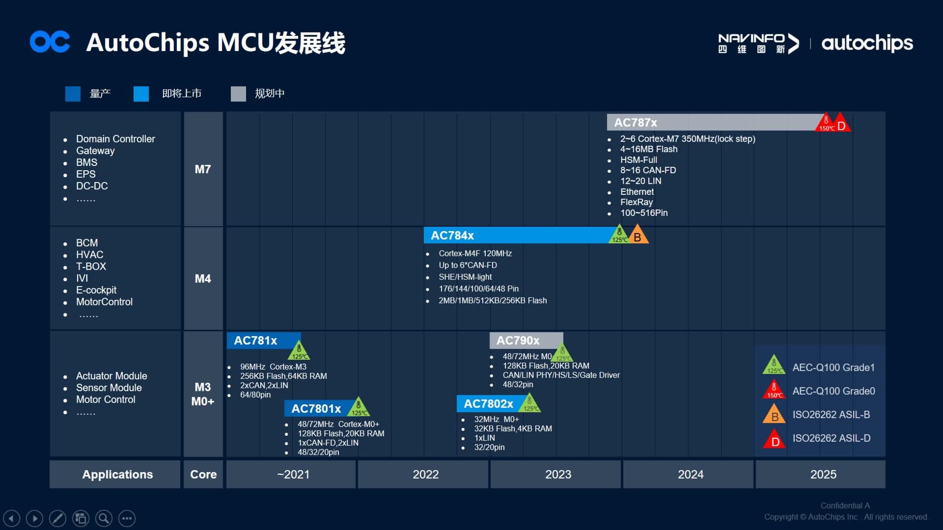 马伟华还在现场分享了AutoChips首颗知足功效清静要求的MCU AC7840x,AC7840x系列是AutoChips首款基于ARM Cortex-M4F 内核的车规级MCU,切合ISO 26262功效清静ASIL-B,支持AUTOSAR 4.4,提供MCAL及设置工具,并且拥有更大的Flash与更多的引脚。AC7840x的应用将越发普遍,尤其突破了对清静性、可靠性要求更高的底盘域和动力域应用。现在,AC7840x已经陆续送样,其中有客户已进入产品验证阶段。