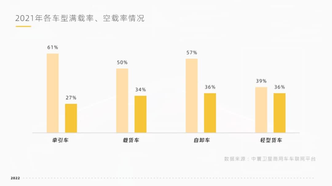 白皮书还通过天下运力平均吨位的上涨反应出车效提升。据中寰卫星车联网大数据显示,2021年,各车型满载率情形划分为:牵引车60.72%、载货车49.58%、自卸车56.76%、轻型货车39.29%,整体略微提升。